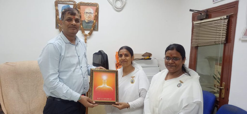 निक जागरण अखबार के संपादक दैवी भ्राता बृजेश जी को रक्षा सूत्र बांधकर ईश्वरीय संदेश देने के पश्चात ईश्वरीय सौगात प्रदान करती हुई बीके सीता बहन एवं बीके बबीता बहन