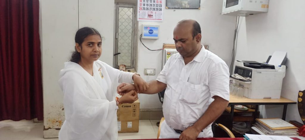 मुजफ्फरपुर पूर्वी के जिला अध्यक्ष भाजपा दैवी भ्राता श्री विवेक कुमार जी को रक्षा सूत्र बांधती हुई राजयोगिनी बीके रानी दीदी जी