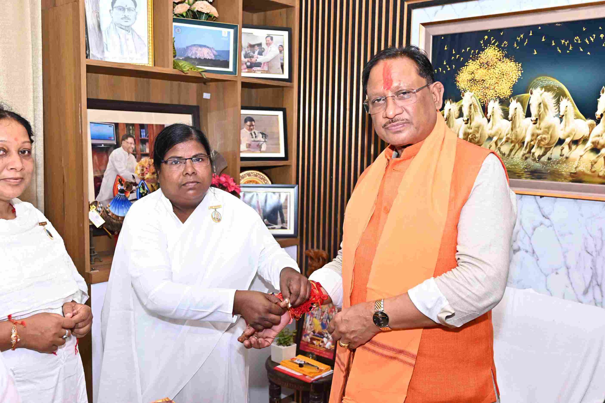 रायगढ़,छग: छग के मुख्यमंत्री माननीय विष्णुदेव साय को उनके गृह ग्राम बगिया में रायगढ़ सेवाकेन्द्र की ओर से बीके उषा बहन ने राखी बांधकर उनके उज्जवल भविष्य की शुभकामनायें दी । इस अवसर पर आयोजित राखी कार्यक्रम में शामिल तपकरा पाठशाला से संबंधित माला बहन तथा बसन्ती बहन ने भी मुख्यमंत्री भ्राता के कलाई में रक्षासूत्र बांध कर मंगलकामनायें की। साथ ही उन्हें ईश्वरीय सौगातें दीं गई ।