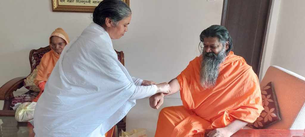 -ऋषिकेश- महंत स्वामी परमानंद दास जी महाराज को राखी बाँधते हुए बी के आरती