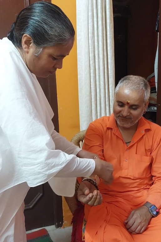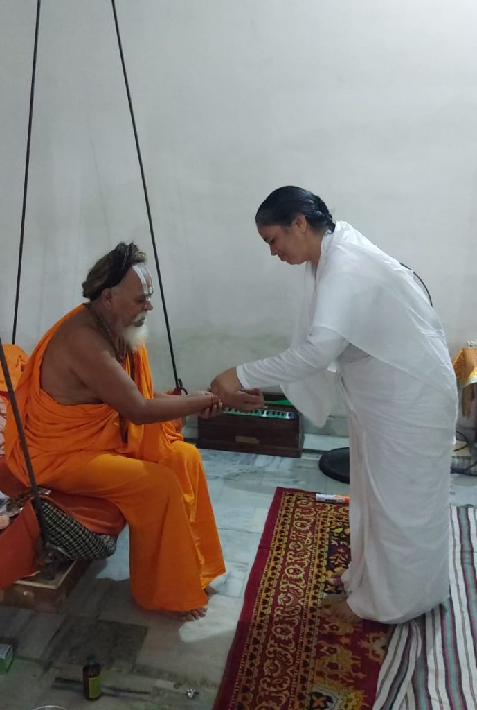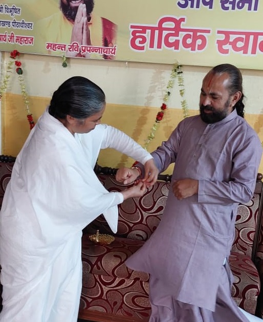 -ऋषिकेश- महंत स्वामी रवि प्रपन्नाचार्य शास्त्री जी महाराज को राखी बाँधते हुए बी के आरती