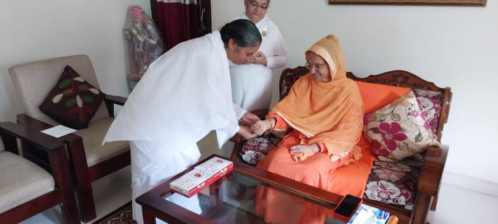 ऋषिकेश- महामंडलेश्वर माता संतोष भारती जी महाराज को राखी बाँधते हुए बी के आरती