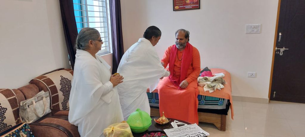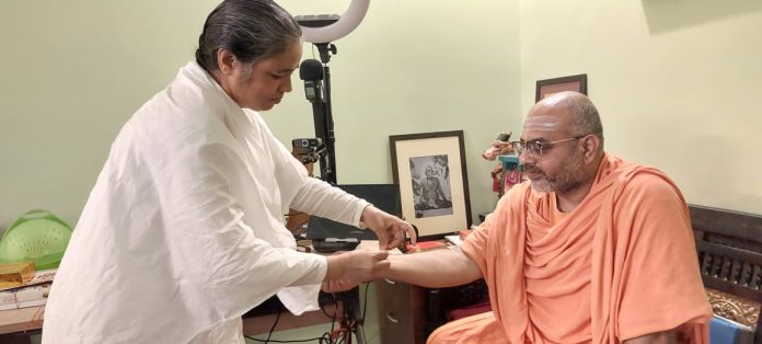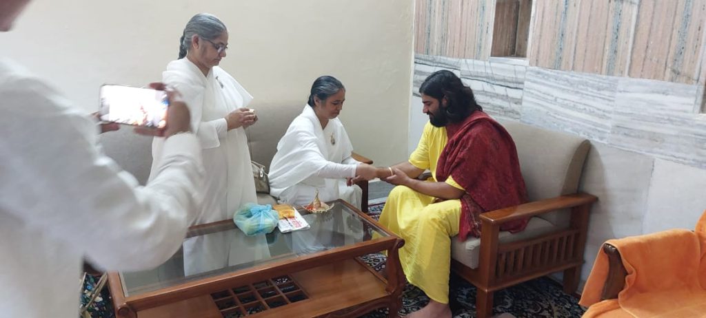 -ऋषिकेश महामंडलेश्वर स्वामी अभिषेक चैतन्य गिरी जी महाराज को राखी बाँधते हुए बी के आरती