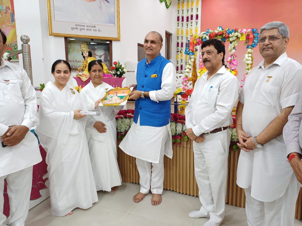 Jalandhar, Punjab: Mr. Shital Vij (guest in Black) is being presented a Godly gift by BK Sandheera Behan (Center Incharge Jalandhar), BK Vijay Behan, BK Sushila Behan, Seema Mata. On the other side are BK Dr. Rattan Lal Bassan (Retd. Chief Medical Officer (CMO)), BK Surinder Sachdeva (Retd. CA), BK Dr. Mahesh Dogra (Neuropsychologist), and one more brother.