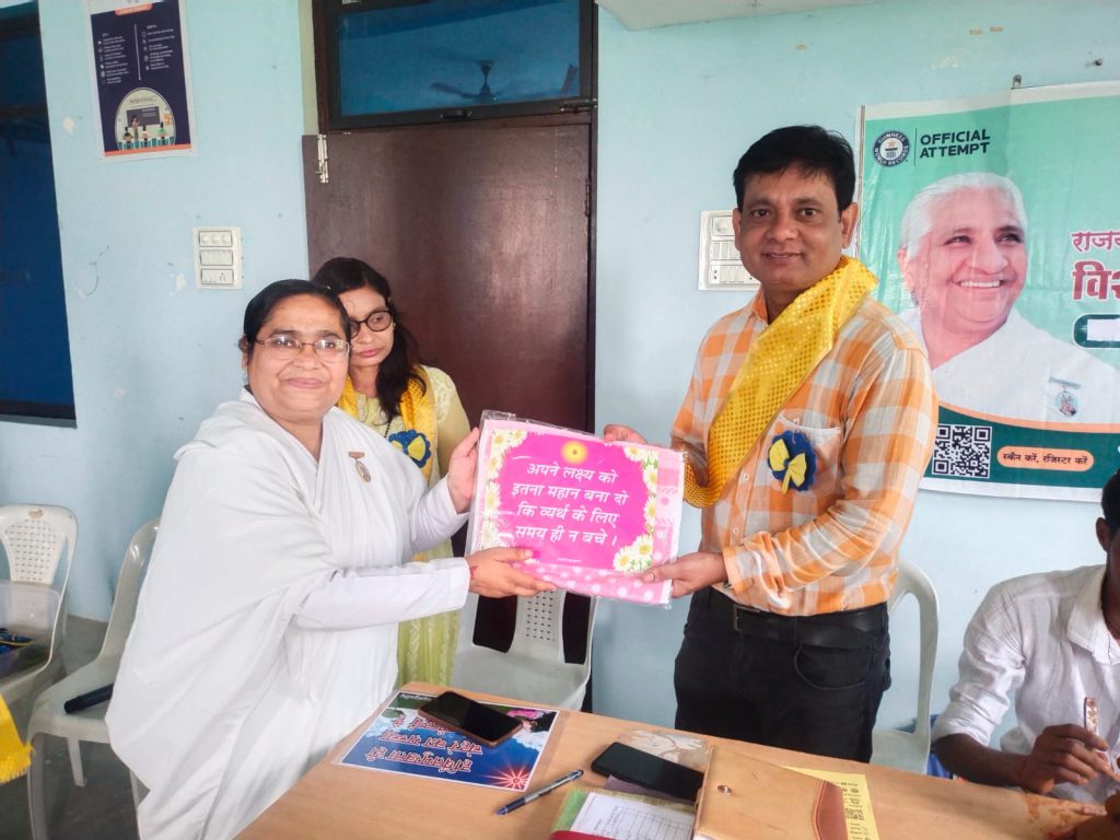 दीपक सोनी नवांकुर संस्था मध्य प्रदेश जन अभियान परिषद सहित सभी का दीदी ने बैज और पट्टे के द्वारा स्वागत किया वा सभी को ईश्वरीय सौगात और प्रभु प्रसाद दिया गया।