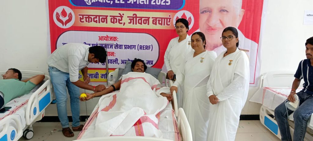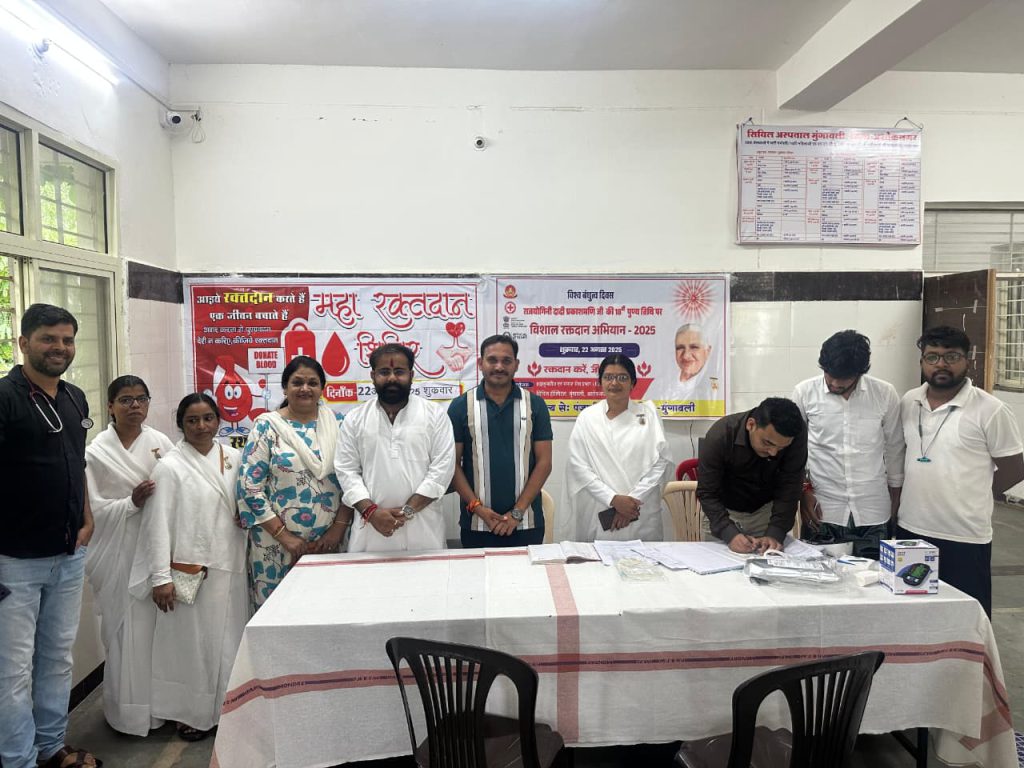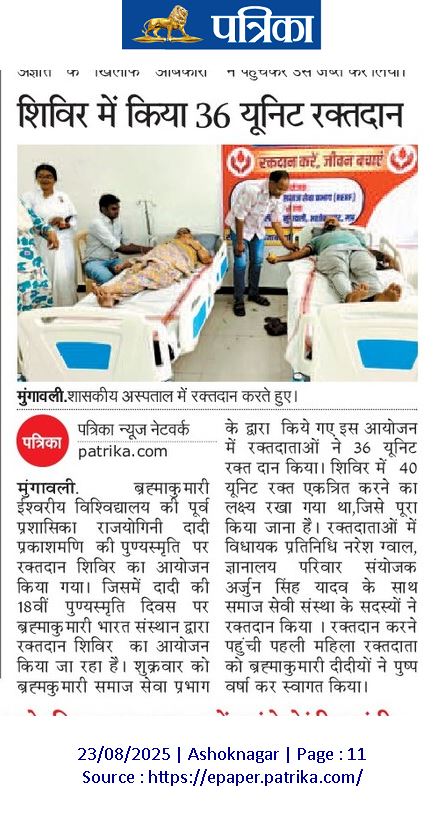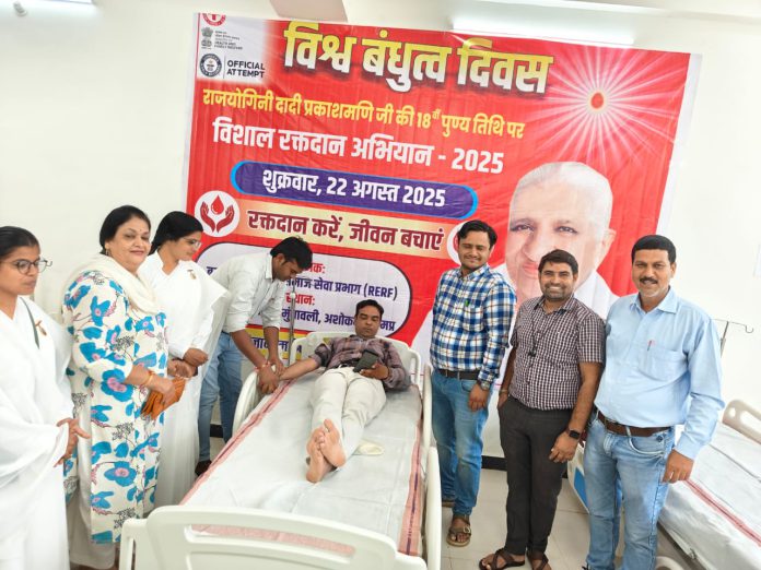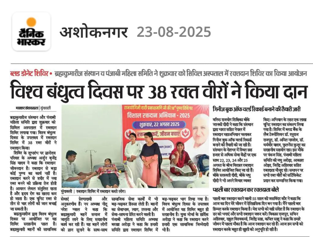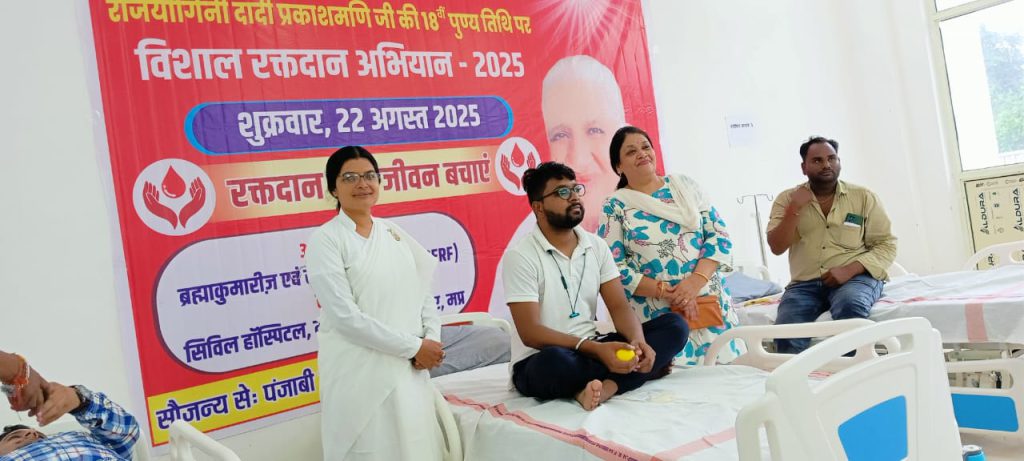 मुंगावली (अशोकनगर),मध्य प्रदेश । ब्रह्माकुमारीज संस्थान और पंजाबी महिला समिति द्वारा शुक्रवार को सिविल अस्पताल में रक्तदान शिविर आयोजित किया गया। पूर्व मुख्य प्रशासिका राजयोगिनी दादी प्रकाशमणि की 18वीं पुण्यतिथि (25 अगस्त 2025) विश्व बंधुत्व दिवस के उपलक्ष्य में आयोजित इस रक्तदान शिविर में 38 रक्तवीरों ने रक्तदान किया। इस दौरान बीएमओ डॉ. अमित पांडे सहित सरकारी अस्पताल के डॉक्टर्स ने सबसे पहले रक्तदान कर लोगों को संदेश दिया।
