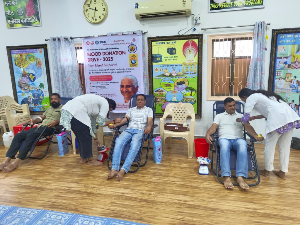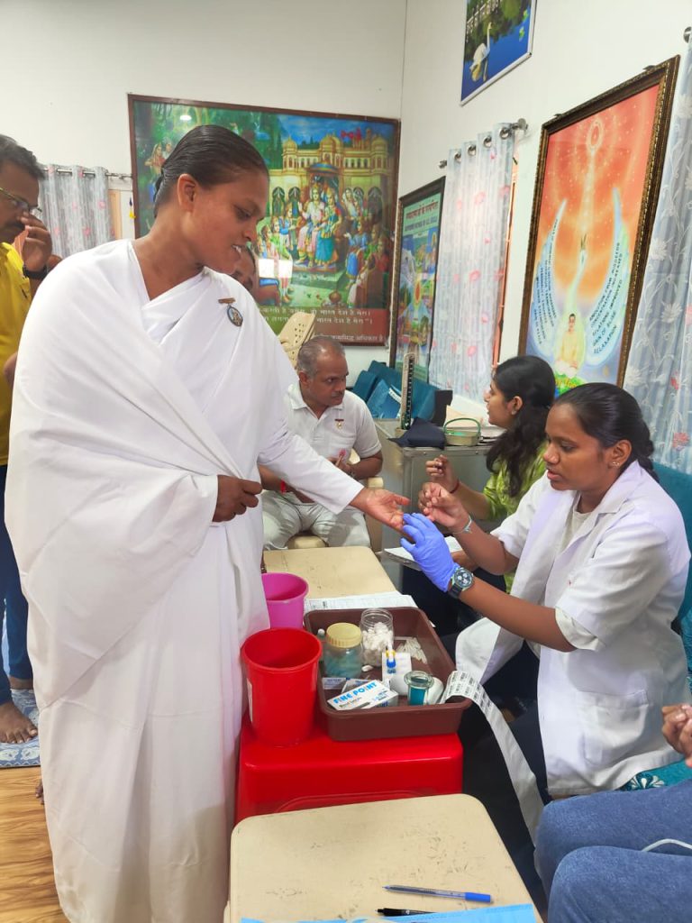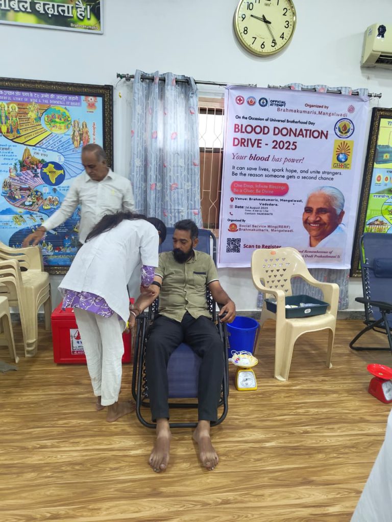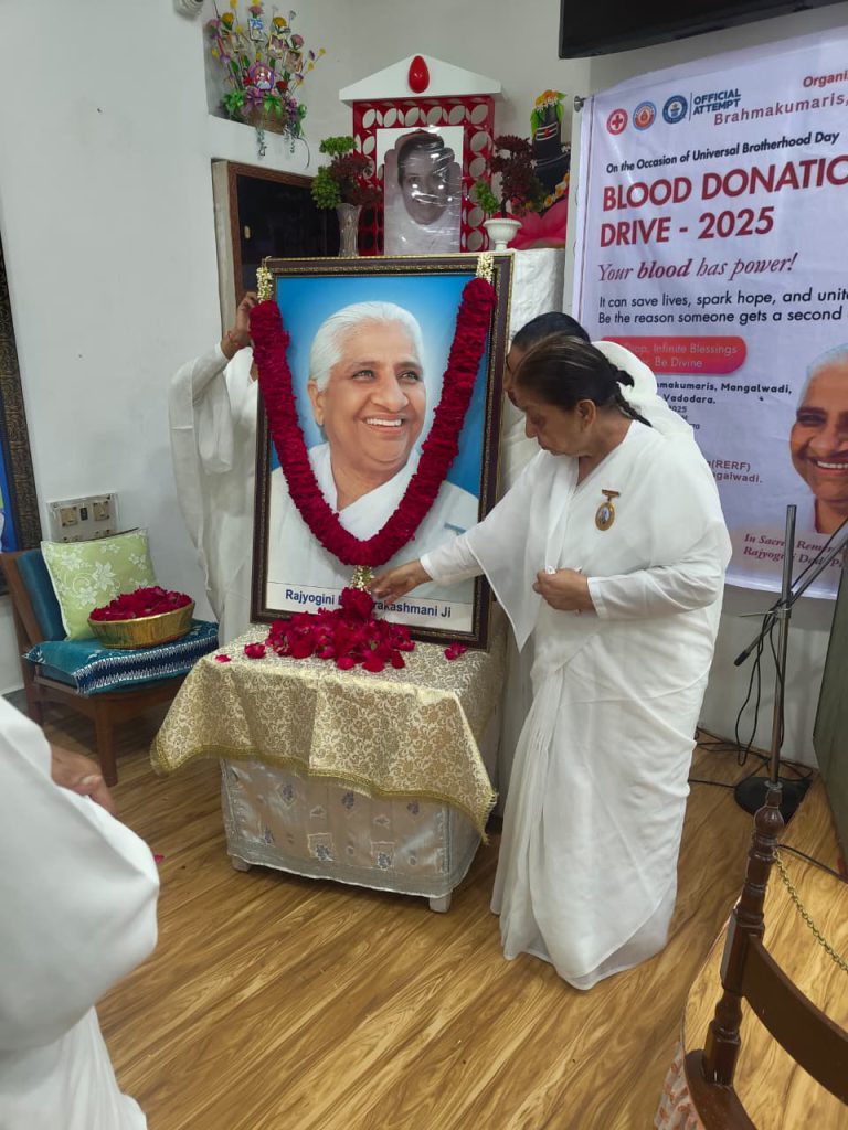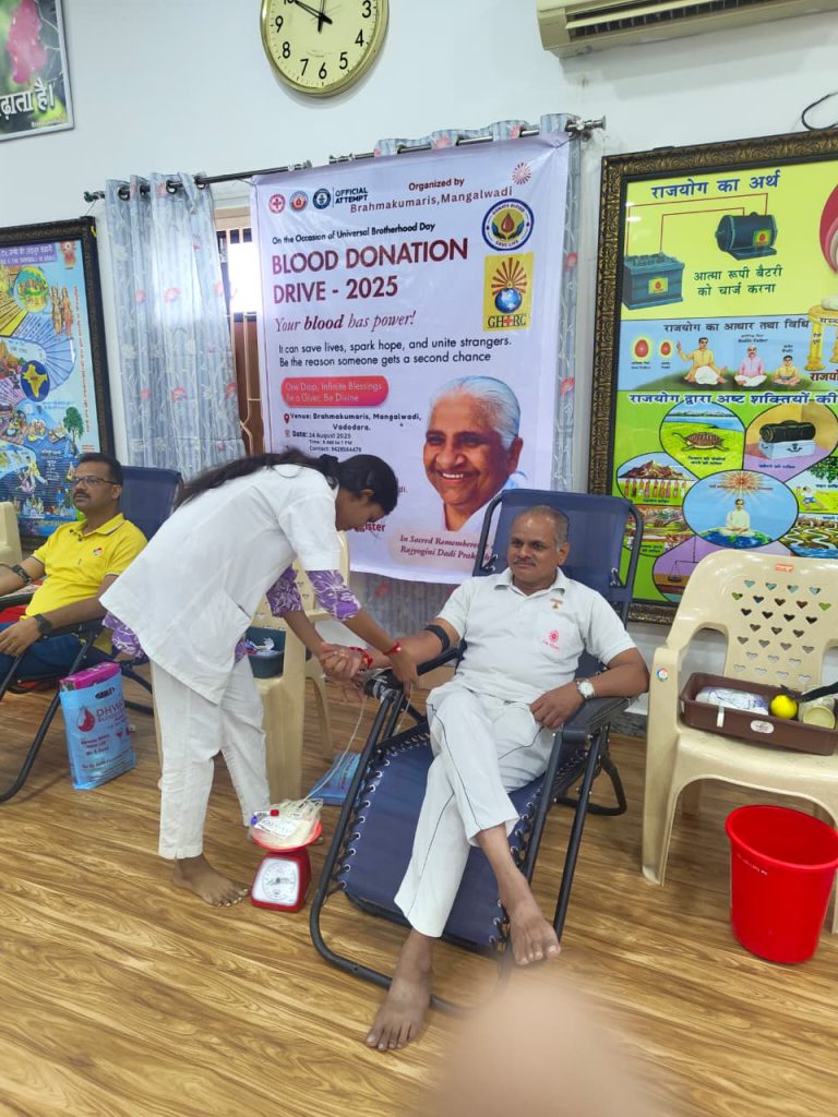 वड़ोदरा ,मंगलवाडी,गुजरात। दादी प्रकाशमणि जी के पुण्य स्मृति दिवस निमित्त श्रद्धांजलि तथा “समाजसेवा प्रभाग” अंतर्गत रक्तदान कैम्प रखा गया l ब्रह्मा कुमारीज़ द्वारा रक्त दान देकर गिनीज वर्ल्ड रेकॉर्ड बनाकर प्यारी दादीजी को सेवाजंलि – श्रद्धांजलि अर्पित करने का विशेष कार्यक्रम रखा हुआ था l ध्वनि ब्लड सेन्टर, वडोदरा के नर्सेज स्टाफ तथा ग्लोबल हॉस्पिटल के डॉ.वैभव शाह द्वारा रक्त दान कैम्प संपन्न हुआ l जिसमे कॉर्पोरटर बालूसाहेब सुर्वे, ध्वनि ब्लड सेन्टर से नर्सेज स्टाफ, ग्लोबल हॉस्पिटल के डॉ.वैभव शाह, बीके राज दीदी, बीके सरिता, बीके सुनीता तथा रक्त दान देने आए हुए महानुभावो ओर बीके भाई बहनोने ने बड़े उमंग से भाग लिया l