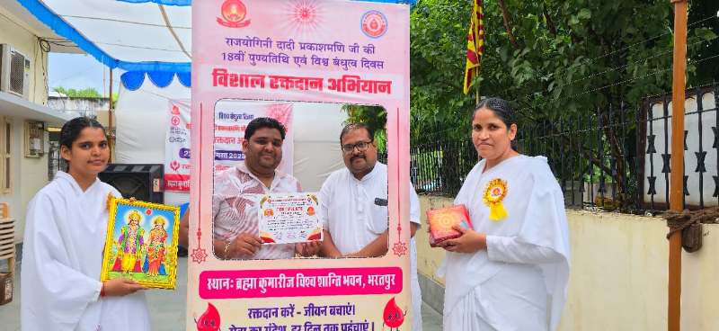 भरतपुर (राजस्थान): प्रजापिता ब्रह्माकुमारी ईश्वरीय विश्वविद्यालय के तत्वावधान में, राजयोगिनी ब्र. कु. कविता दीदी के निर्देशन एवं सह प्रभारी राजयोगिनी ब्र. कु. बबीता दीदी की अध्यक्षता में विश्व शांति भवन, भरतपुर में भव्य रक्तदान शिविर का आयोजन हुआ। यह शिविर आदरणीया दादी प्रकाशमणि जी की 18वीं पुण्यतिथि की स्मृति के उपलक्ष में आयोजित किया गया।