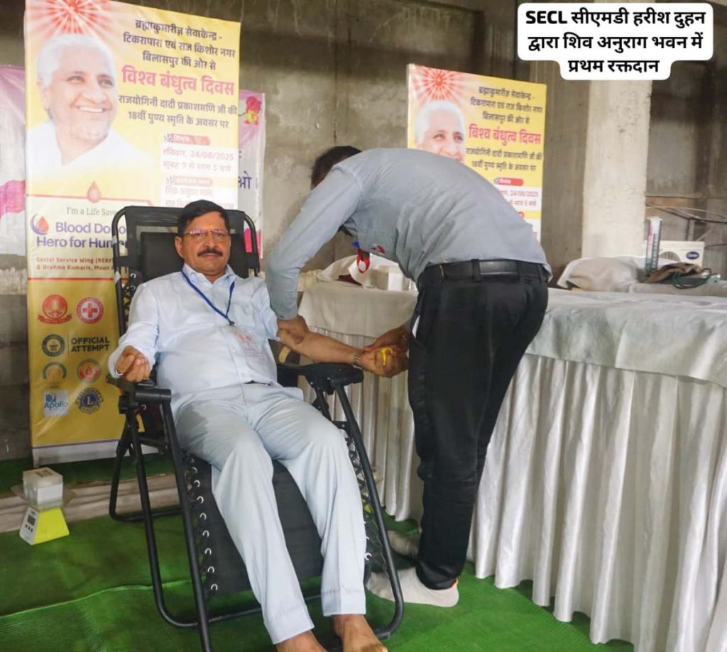 रक्तदान को महान कार्य बताते हुए एस ई सी एल सीएमडी हरीश दुहन ने किया शिव अनुराग भवन में प्रथम रक्तदान