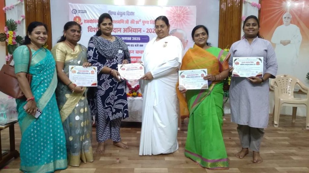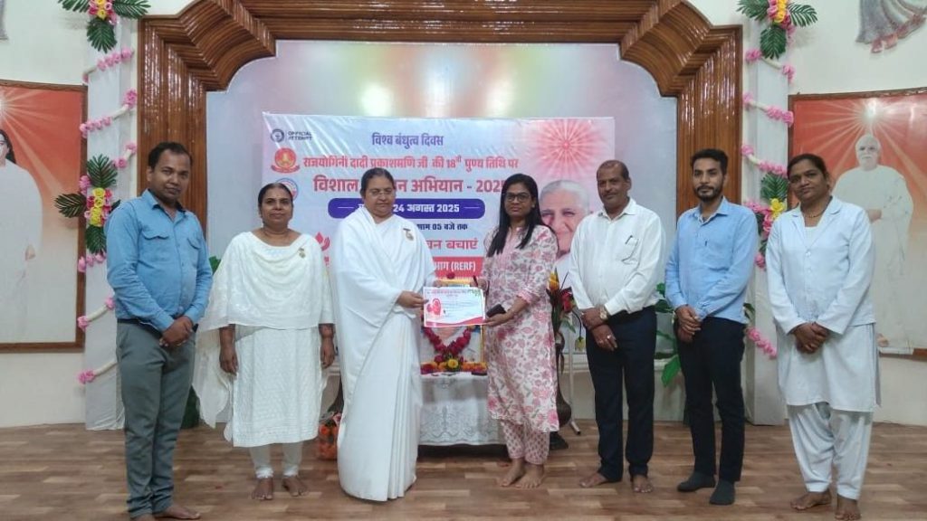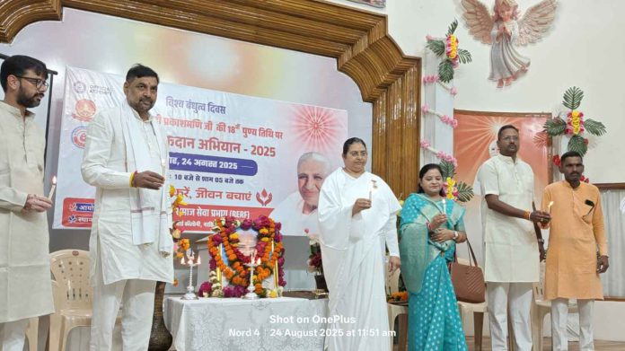 नरसिंहपुर,मध्य प्रदेश। विश्व बंधुत्व की प्रेरणा स्रोत राजयोगिनी ब्रह्मा कुमारीज की पूर्व मुख्य प्रशासिका राजयोगिनी डॉ दादी प्रकाशमणि जी की 18वीं पुण्य स्मृति दिवस पर विशाल रक्तदान अभियान का कार्यक्रम जो कि विगत 17 से 25 अगस्त 2025 तक समग्र भारत एवं नेपाल में विशाल रक्तदान अभियान चलाया जा रहा है ।इसी क्रम में प्रजापिता ब्रह्माकुमारी ईश्वरीय विश्व विद्यालय नरसिंहपुर सेवा केंद्र में दिनांक 24/ 8/ 2025 को प्रातः 10:00 बजे से शाम 5:00 बजे तक विशाल रक्तदान शिविर कार्यक्रम आयोजित किया गया।