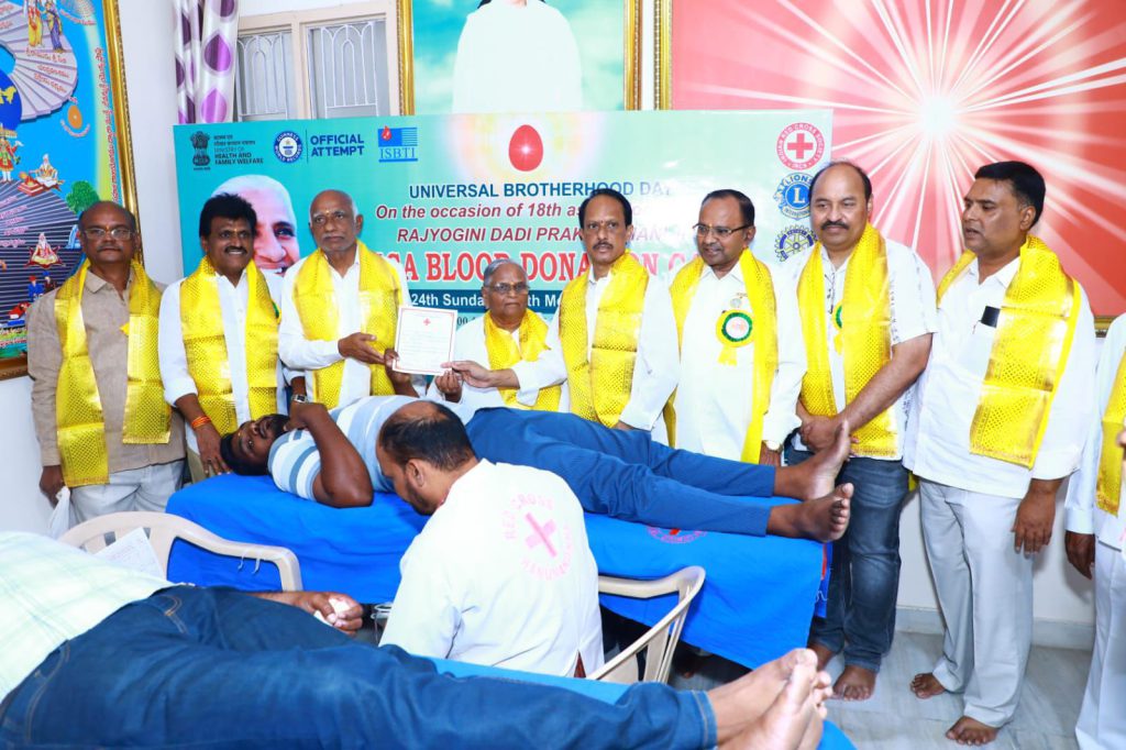 Presenting Blood Donation Certifate to Donor – brothers Shri E. V. Srinivasa Rao – Member of the State Governing Council of the Indian Red Cross Society, Rajayogini B. K. Savita Didi ji – Warangal Sub-Zone Administrator, Bro. Ganesh -Rotary Club President , Bro. Ponna Harinath – Rotory Club Secretary , etc.