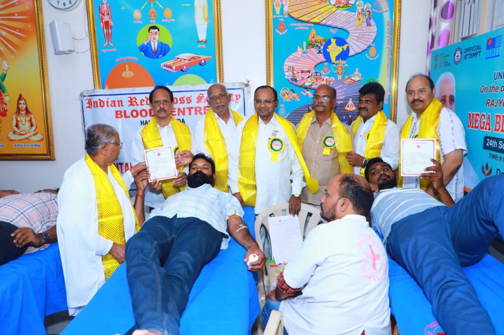 Presenting Blood Donation Certifate to Donor – brothers Shri E. V. Srinivasa Rao – Member of the State Governing Council of the Indian Red Cross Society, Rajayogini B. K. Savita Didi ji – Warangal Sub-Zone Administrator, Bro. Kumara Swamy – Local Muncipal Corporator, Bro. Ganesh -Rotary Club President , Bro. Ponna Harinath – Rotory Club Secretary , etc.