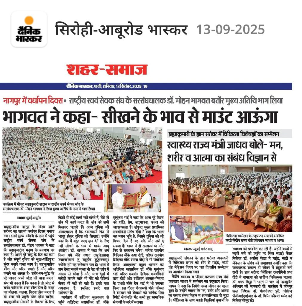 नागपुर,महाराष्ट्र। ब्रह्माकुमारीज़ नागपुर के विश्व शांति सरोवर का सातवां वर्धापन दिवस मनाया गया। इसमें मुख्य अतिथि के रूप में पहुंचे राष्ट्रीय स्वयं सेवक संघ के सरसंघचालक डॉ. मोहन भागवत ने कहा कि ब्रह्माकुमारीज़ मनुष्य के कल्याण का काम है। अपने पूरे राष्ट्र के हित का काम है और संपूर्ण दुनिया को सुख-शांतियुक्त सुंदर बनाने वाला काम है। यह एक पंथ पर तीन-तीन काज हैं। इस दिशा में हम कामकाज करने में लगे हैं। ब्रह्माकुमारीज़ शील और चरित्र जगाते हैं और चरित्र जगाने का आधार है- शरीर-मन-बुद्धि के परे जाकर अपने अंतर की यात्रा करना। संघ भी कहता है कि बनना है तो अंदर से बनो। चारित्र के अंदर शील होता है। बाहर का बोलना, चलना, फिरना ठीक करना है तो अंदर की प्रवृत्ति ठीक होना चाहिए। उसके लिए गहराई में अंदर उतरकर वहां से हम सब ठीक करते हैं। सबका तरीका अपना-अपना है लेकिन मूल में एक ही है- अंदर को जगाओ। एक ही उद्देश्य को लेकर परस्पर कार्य करने वालों को परस्पर पूरक होना आवश्यक है। हम आपस में परस्पर सहयोगी होकर चलें, परस्पर बाधक न बनें। आज दुनिया की आवश्यकता है कि भारतवासी फिर से भरपूर होकर दुनिया को सिखाएं। उन्होंने कहा कि मैं बहुत जल्द माउंट आबू आऊंगा। मैं ज्ञान देने के लिए नहीं सीखने के भाव से माउंट आबू आऊंगा।