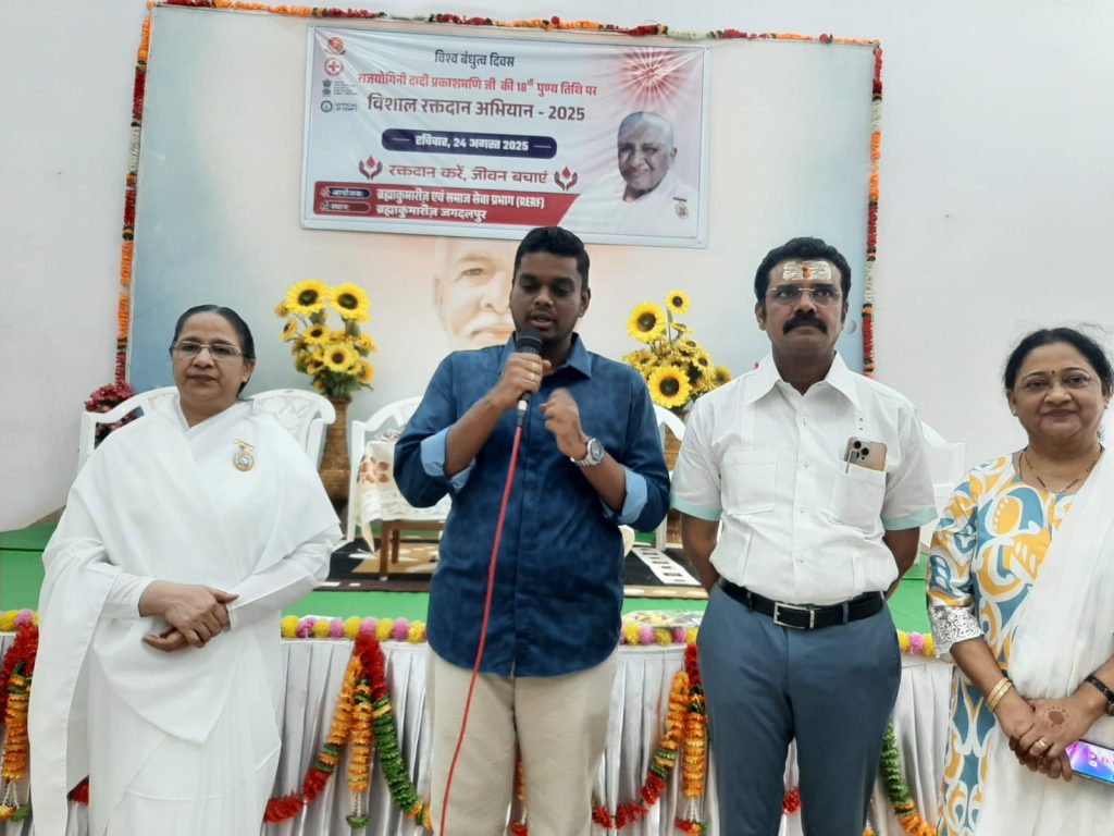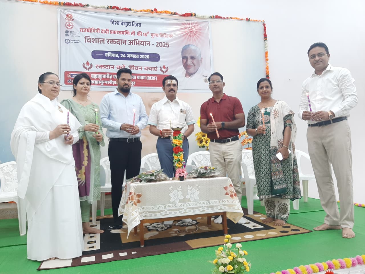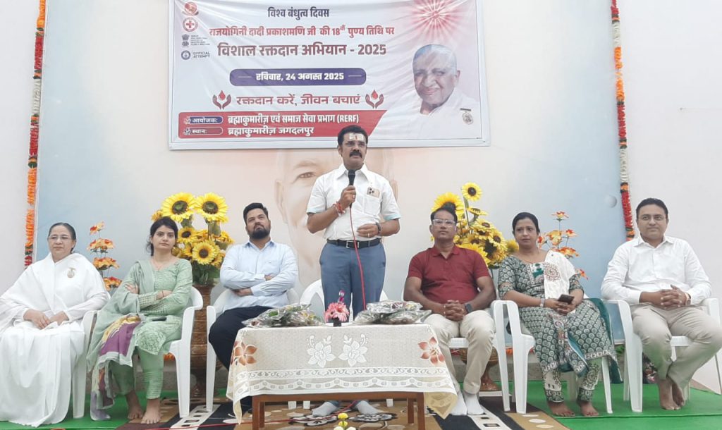जगदलपुर, मध्य प्रदेश। दादी प्रकाशमणि जी के 18 पुण्यतिथि पर रक्तदान अभियान कार्यक्रम का दीप प्रज्जवलित कर उद्घाटन करते हुए महापौर माननीय भ्राता संजय पाण्डे जी, मेडिकल काॅलेज के डाॅक्टर भ्राता के.एल. आजाद जी, अध्यक्ष रोटरी क्लब माननीय भ्राता राहुल जैन जी, अध्यक्ष इनरव्हील क्लब माननीया बहन लाइबा चामड़िया, सचिव माननीय बहन प्रीति आजाद, पूर्व अध्यक्ष रोटरी क्लब माननीय भ्राता विवेक सोनी जी एवं ब्रह्माकुमारी मंजूषा दीदी।