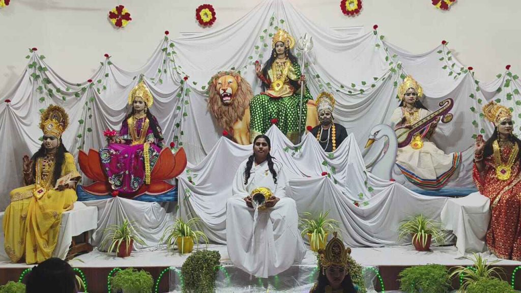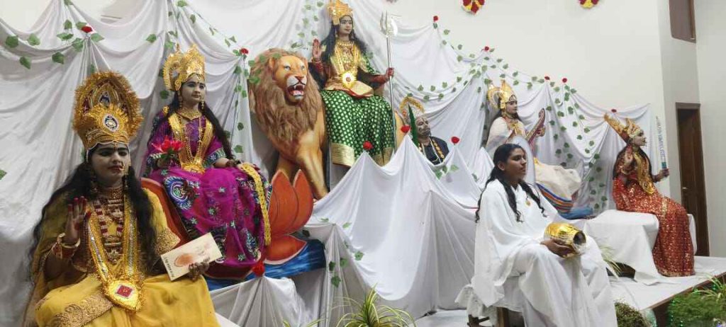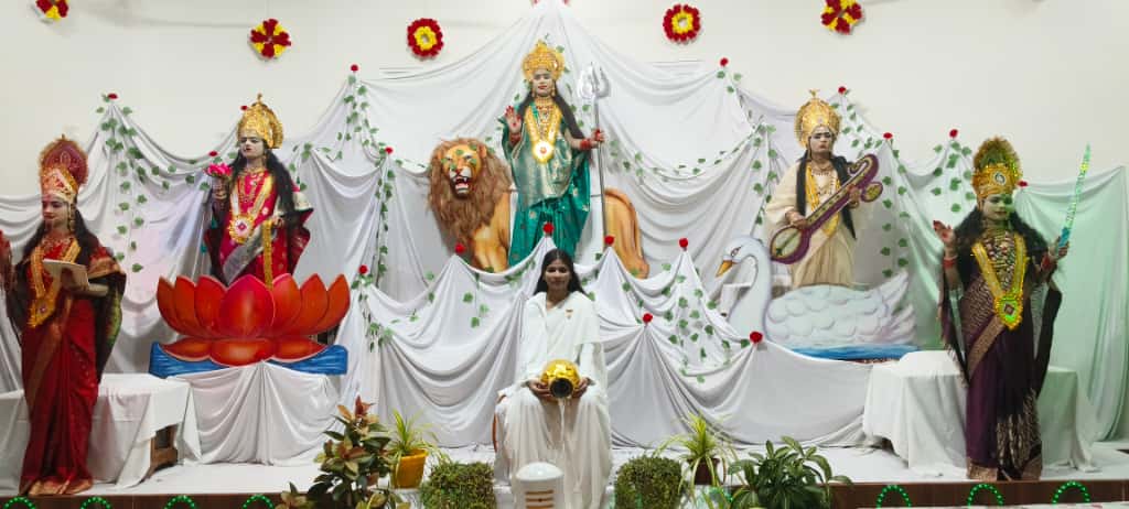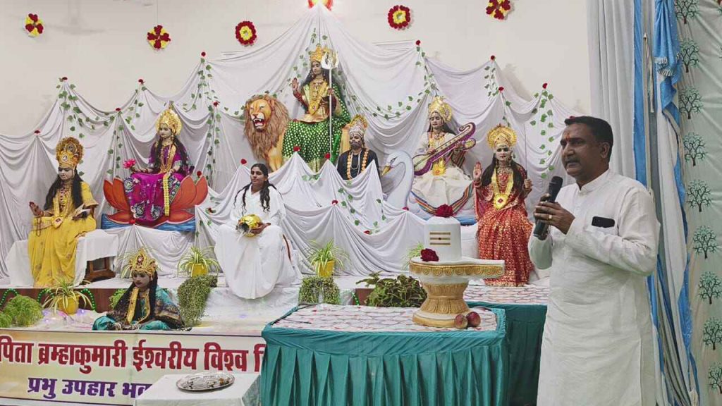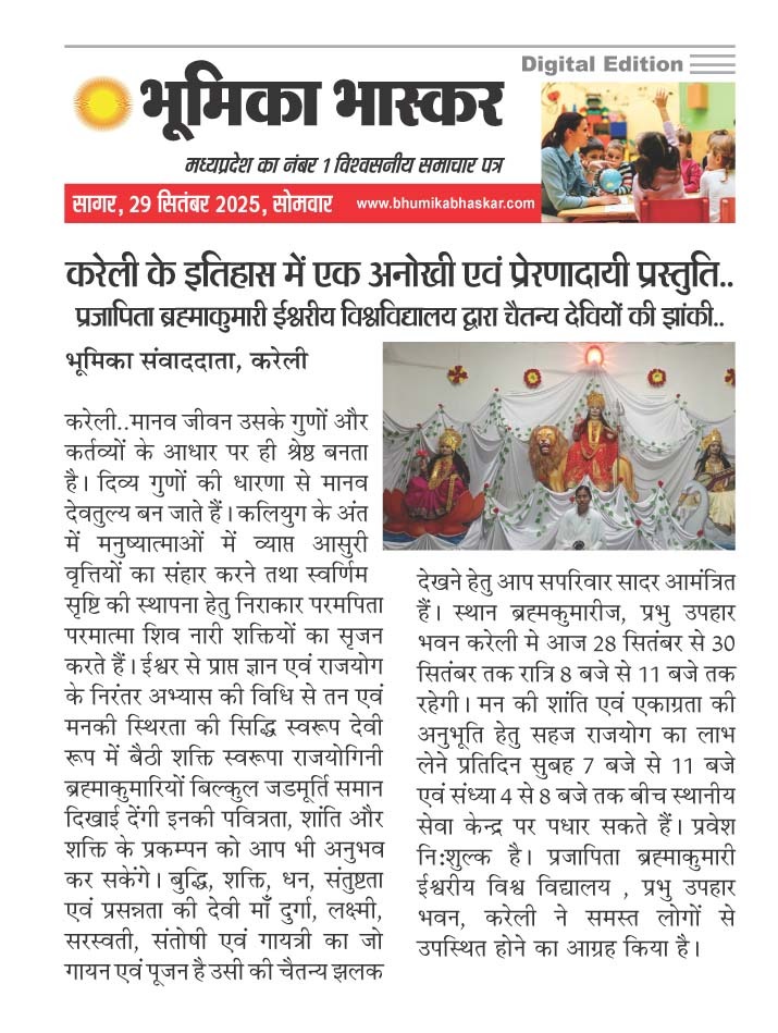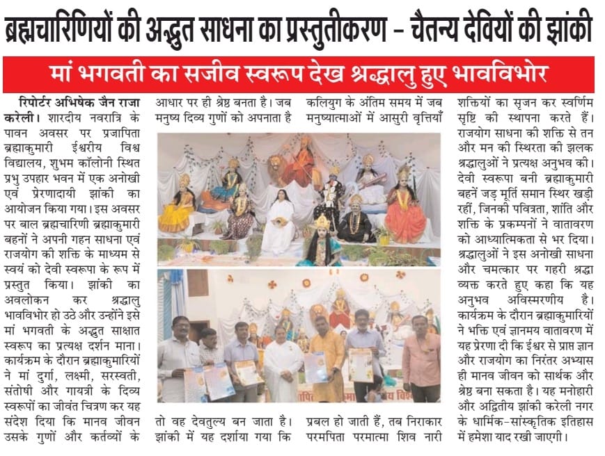 करेली , मध्य प्रदेश। शारदीय नवरात्रि के पावन अवसर पर प्रजापिता ब्रह्माकुमारी ईश्वरीय विश्व विद्यालय, शुभम कॉलोनी स्थित प्रभु उपर भवन में एक अनोखी एवं प्रेरणादायी झांकी का आयोजन किया गया। इस अवसर पर बाल ब्रह्मचारिणी ब्रह्माकुमारी बहनों ने अपनी गहन साधना एवं राजयोग की शक्ति के माध्यम से स्वयं को देवी स्वरूपा के रूप में प्रस्तुत किया झांकी का अवलोकन करने वाले भावविभोर हुए और उन्होंने इसे मातारानी के अद्भुत साक्षात स्वरूप का प्रत्यक्ष दर्शन माना।