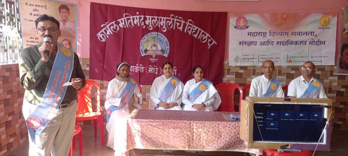 वर्धा(महाराष्ट्र): महाराष्ट्र सरकार और ब्रह्मा कुमारीज़ द्वारा दिव्यांग लोगों में समानता और संरक्षण की जागरूकता पैदा करने के लिए एक अभियान चलाया जा रहा है उसके अंतर्गत कार्मेल मतिमंद विद्यालय मे कार्यक्रम। कार्यक्रम मे उपस्थित बी. के स्नेहा बहेन, बी.के. रीना बहेन , ब्रह्माकुमार अतुल भाई , संजय भाई, स्कूल प्रमुख सिस्टर रिनी।