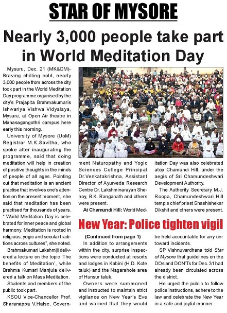 श्रीमती एम.के. सविता (कुलसचिव, मैसूरु विश्वविद्यालय): उन्होंने वर्तमान तकनीक प्रधान युग में शांति और आध्यात्मिकता की आवश्यकता पर जोर दिया। उन्होंने कहा कि दैनिक ध्यान से शारीरिक और मानसिक चुनौतियों का सामना करना आसान हो जाता है।