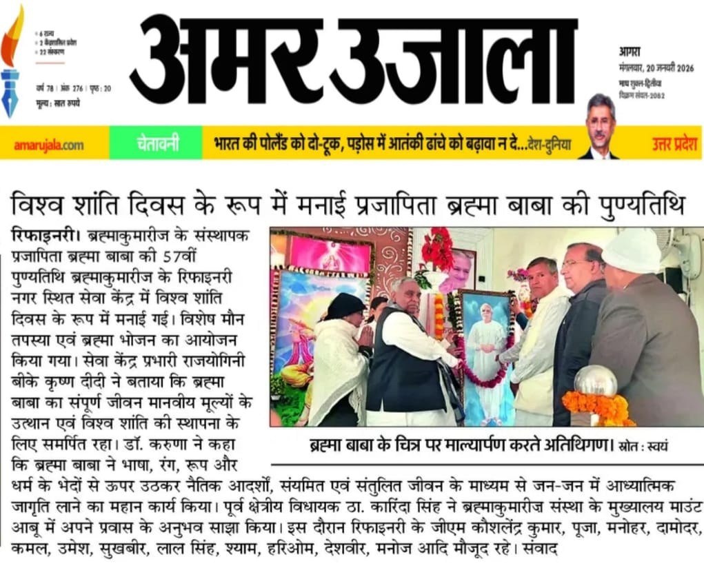 मथुरा, उत्तर प्रदेश। ब्रहमाकुमारी संस्था के स्थानीय सेवाकेद्र रिफाइनरी नगर मे संस्था के साकार संस्थापक प्रजापिता ब्रह्मा बाबा की 57 वी पुण्यतिथि विश्व शांति दिवस के रूप मे विविध आयोजनो के साथ मनाई गई ।इस अवसर पर सेवा केंद्र पर विशेष मौन तपस्या और ब्रह्मा भोजन का आयोजन किया गया।